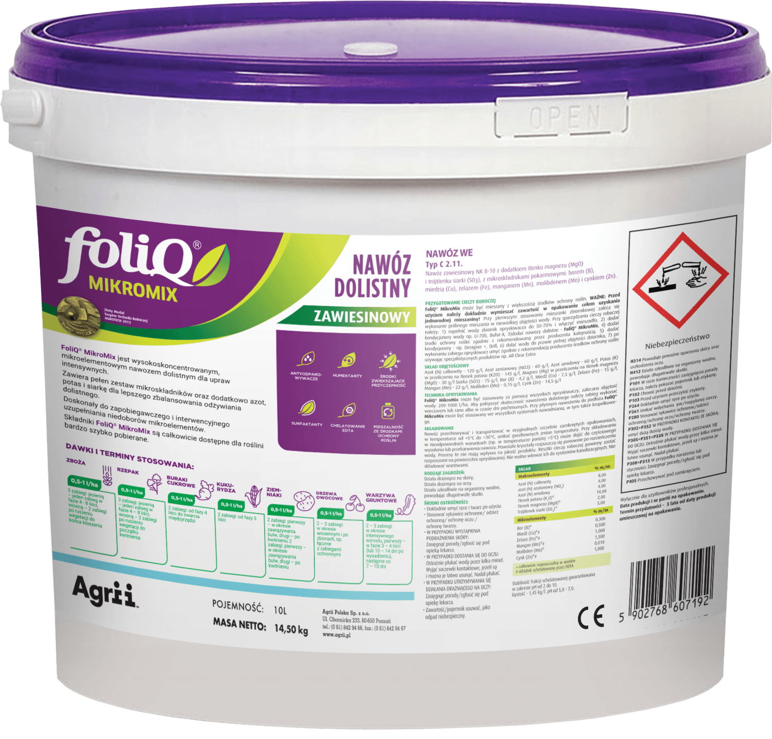 Nawóz wieloskładnikowy FoliQ MikroMix jest przeznaczony do stosowania w uprawach rolniczych, sadowniczych i warzywniczych.Nawóz wieloskładnikowy FoliQ MikroMix zawiera kompleks makro i mikroelementów dopasowanych do potrzeb upraw intensywnych.
